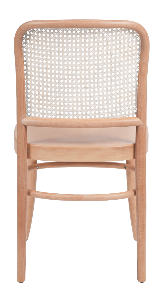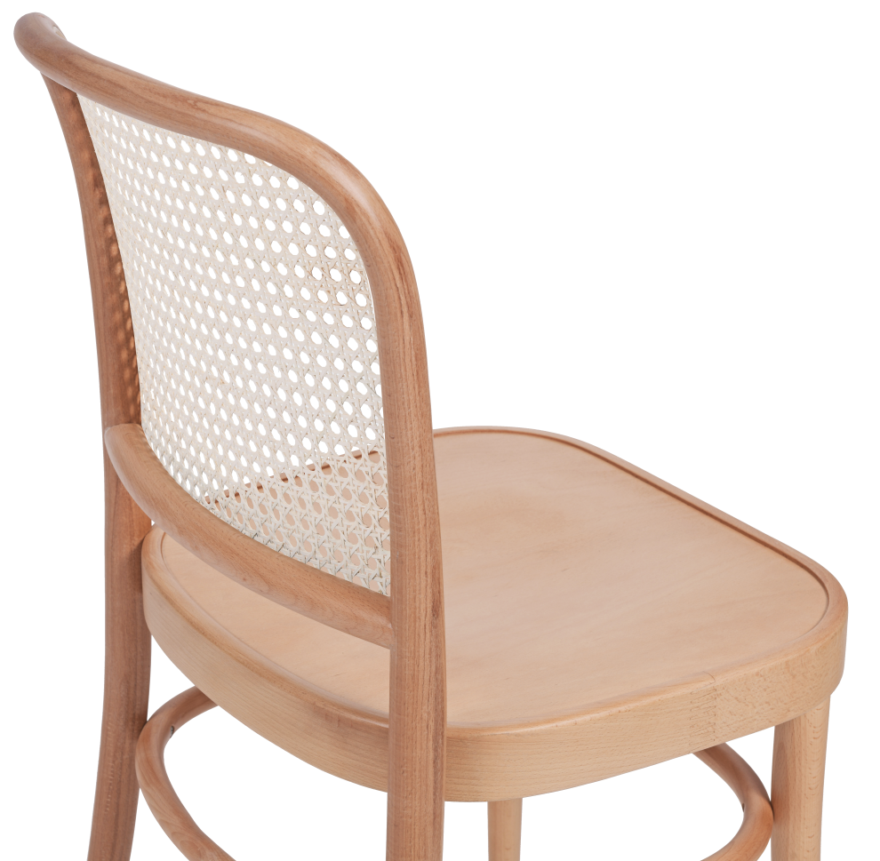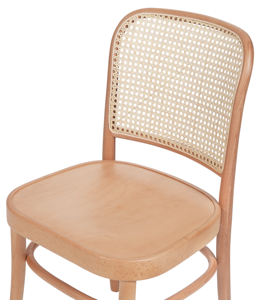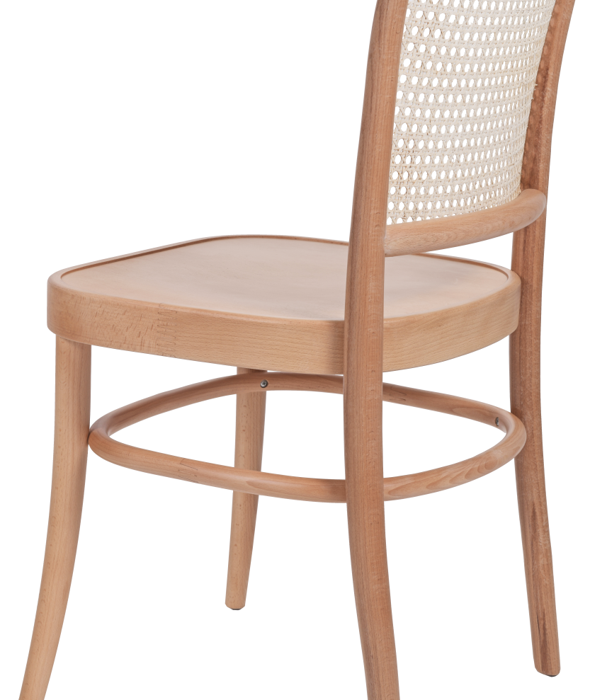 A szék különleges karakterét a bécsi rattan szövésű háttámla adja, amely finom textúrát és könnyed eleganciát kölcsönöz a bútornak. A háttámla nemcsak esztétikus, hanem kényelmes támaszt is biztosít, így a szék hosszabb használat során is komfortos.