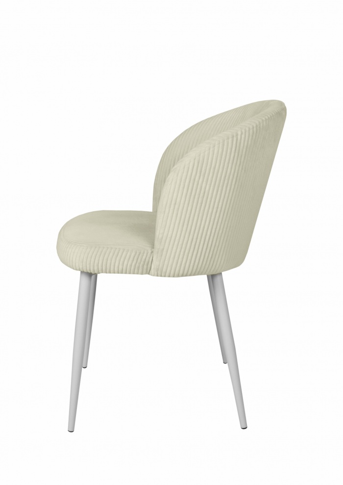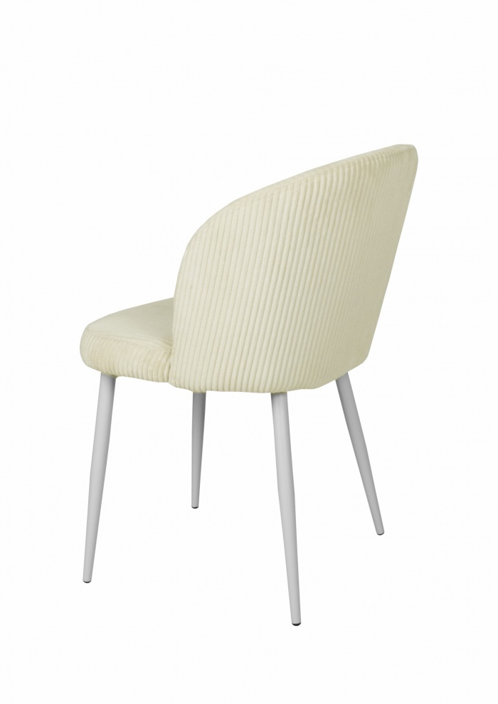 A stabilitásról a fehérre festett fém lábak gondoskodnak, amelyek biztos tartást nyújtanak, miközben modern, letisztult kontrasztot alkotnak a bézs kárpittal. A könnyed szerkezetnek köszönhetően a szék kisebb terekben is harmonikusan elhelyezhető.