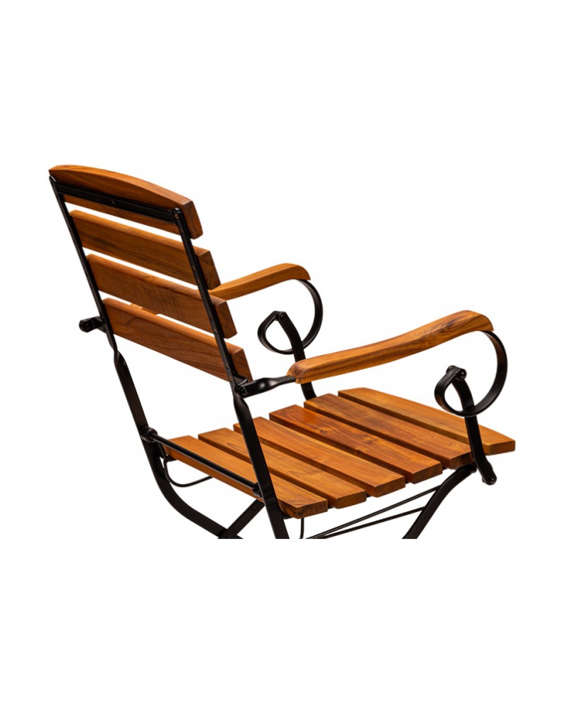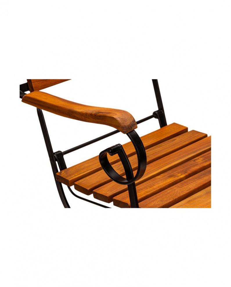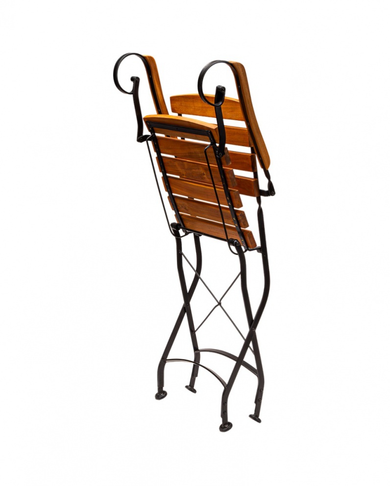 A váz 6 mm vastag, fényes fekete porszórt acél, amely stabilitást és hosszú élettartamot biztosít. Az ülés és a háttámla 19 mm vastag, 55 mm széles akácfa lécekből készült, amelyek természetes megjelenést és kényelmes ülést nyújtanak. A szék összecsukható, így könnyen tárolható és gyorsan előkészíthető vendégek számára.