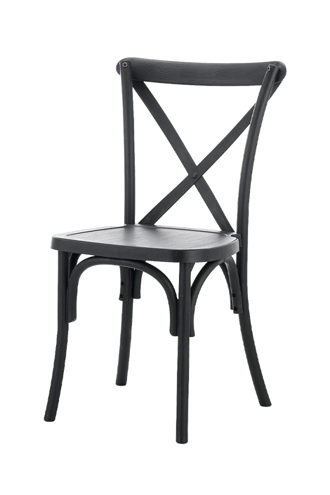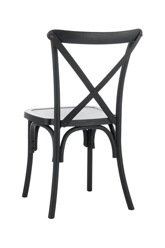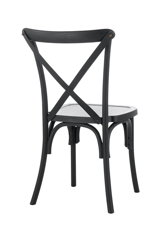 A szék jellegzetes keresztpántos háttámlája stabilitást és eleganciát biztosít. Fekete színe klasszikus és modern környezetben egyaránt jól mutat, kiemelve a rendezvény stílusát.